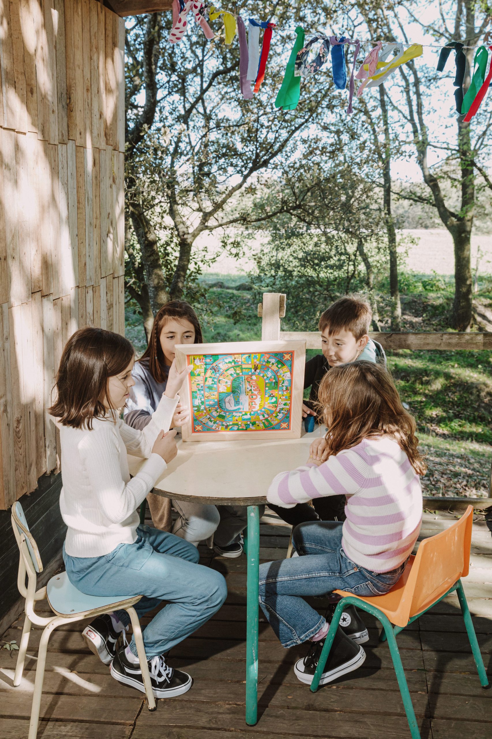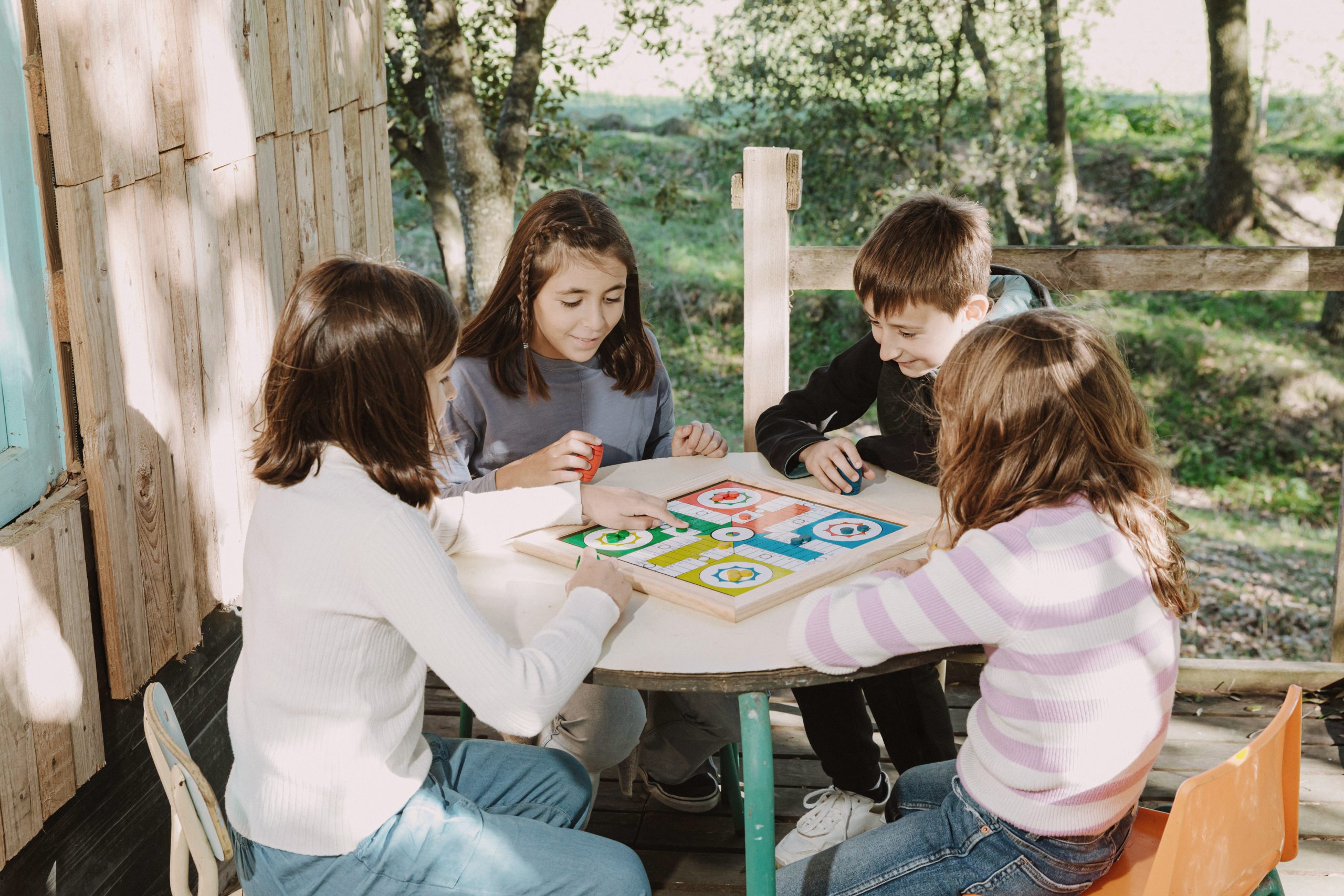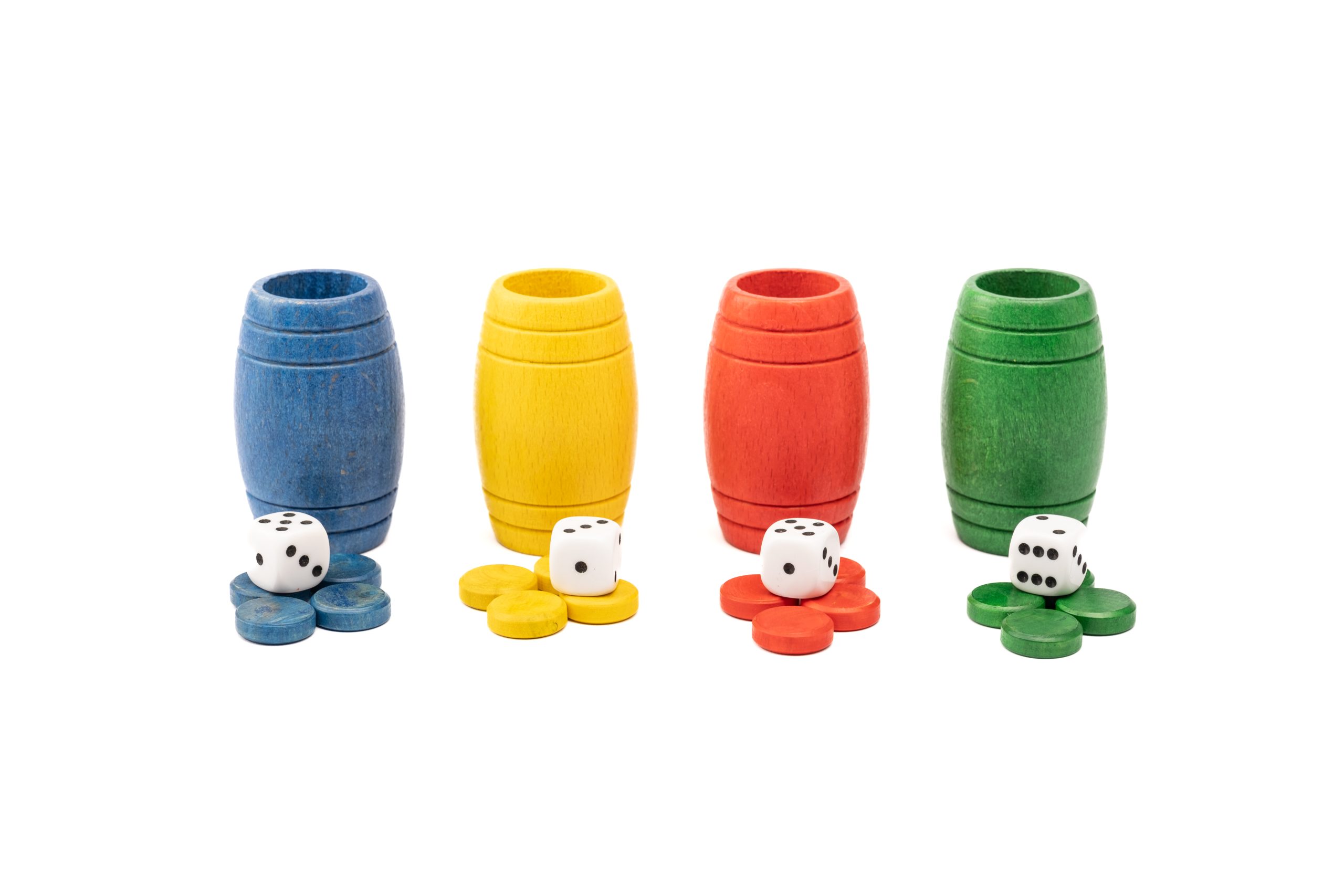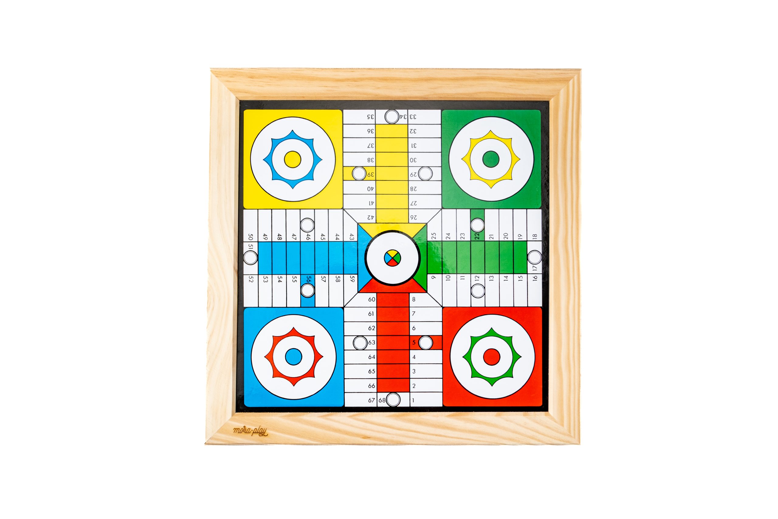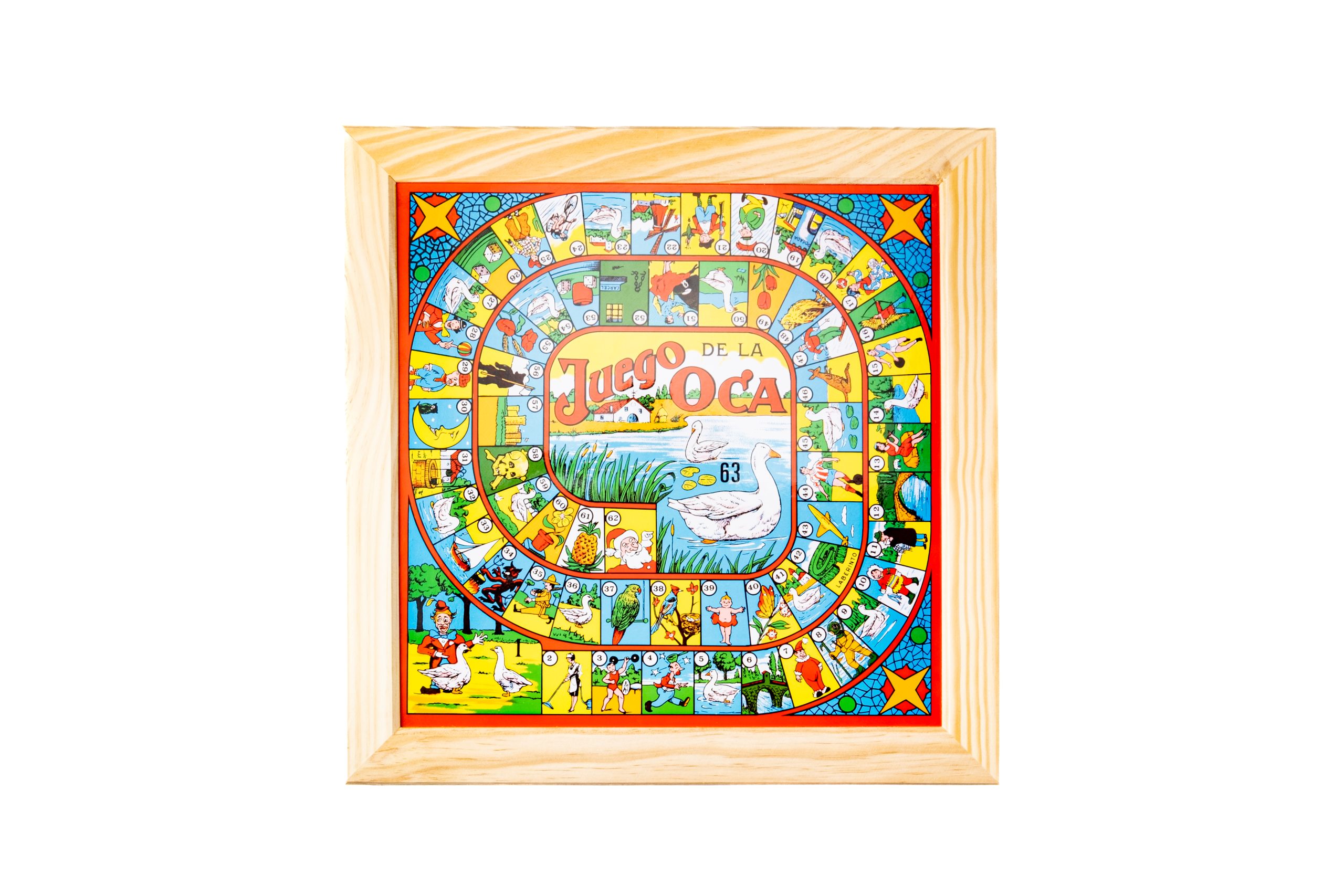 Conjunto del juego del parchís y de la oca de toda la vida, con un marco de madera de pino natural sin tratar. También incluye 4 cubiletes de madera de haya, fichas de madera de boj teñidas de los colores del parchís y sus dados. ¡Un juego a cada lado del tablero para no aburrirse nunca!