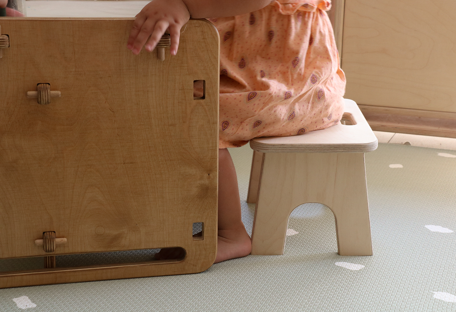 Si tens la nostra cadira/caixa FABA, encaixen a la perfecció: La cadira funciona com a taula i aquest tamboret per seure.